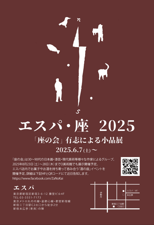なお、「エスパ・座 2025」として、新宿三丁目の「エスパ」にてささやかな小品展が同時開催されております。「エスパ」は新宿末廣亭(寄席)のお隣でございます。お近くにお越しの際にはお寄り頂きお寛ぎくださいませ。